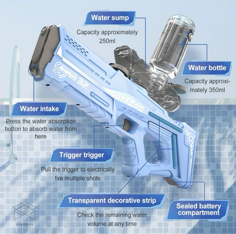 Make every water battle more powerful and exciting with this Automatic Electric Water Gun featuring 10-meter long-range spray and instant water absorption technology. Designed for seamless refills and continuous shooting, this rechargeable high-pressure water blaster delivers maximum performance without manual pumping. Perfect for pool parties, beach fun, and summer outdoor games.